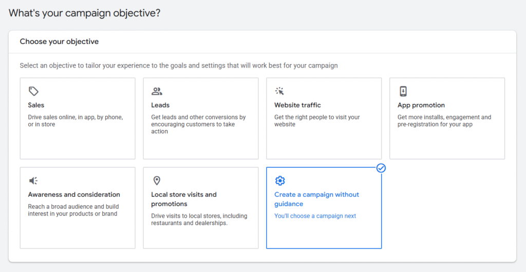When creating a new PMax campaign, you’ll be asked to choose a goal. For Ad Grant accounts, the recommended approach is to select “Create a campaign without a goal’s guidance”. This prevents Google from overly influencing your settings with automated recommendations that may not suit nonprofit goals.