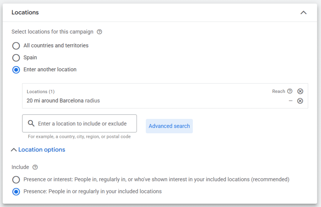Locations: Avoid targeting entire countries unless your nonprofit truly serves a national audience. Instead, define specific states, regions, or use Radius Targeting (e.g. 50 miles around your city). The more specific your geographic targeting, the more relevant your traffic.