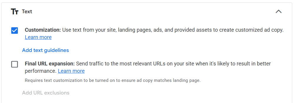 You can use “Text optimization” without Final URL Expansion. This makes sense if you think AI could create better headlines & descriptions than the ones that you configured manually. Sometimes AI find great ideas, sometimes they create awful or irrelevant texts, so it’s a small gamble. But it usually don’t have a huge impact and it’s certainly not as important as the “Final URL Expansion” setting.