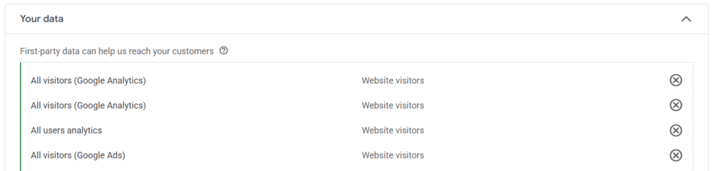 PMax will analyze these visitors and find new users who share similar characteristics. This is one of the most powerful signals available. You can target all your website visitors or specific segments (eg. Users that have completed a purchase or donation, visited a certain page or section of your website, etc.)