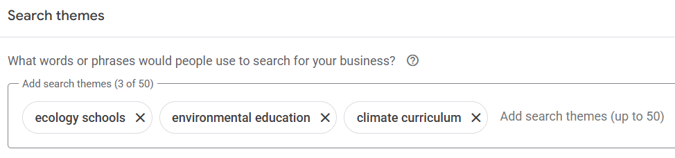 Search Themes are general topics relevant to your campaign. They are NOT keywords, but they are related, they provide topic guidance to the AI. For example, if you’re running a campaign for environmental education resources, your Search Themes might include: “ecology schools”, “environmental education” or “climate curriculum”.