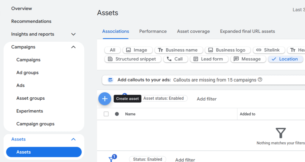 In your Google Ads account, navigate to the Assets menu, select the “Location” asset type, and link your Google Business Profile to your Google Ads account. Location assets are typically added at the account level. Only set them at the campaign level if your organization has multiple locations and needs to show different addresses for different campaigns.