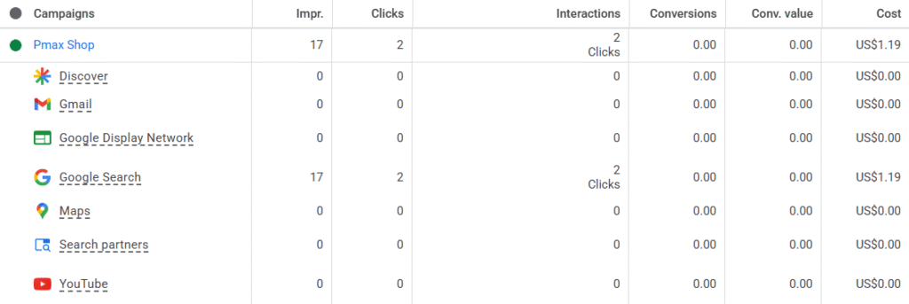 In standard (paid) Google Ads accounts, PMax campaigns can serve ads across Google’s entire inventory: Search, YouTube, Display, Discover, Gmail, and Maps. For Ad Grant accounts, it only works for Seach and Maps.
