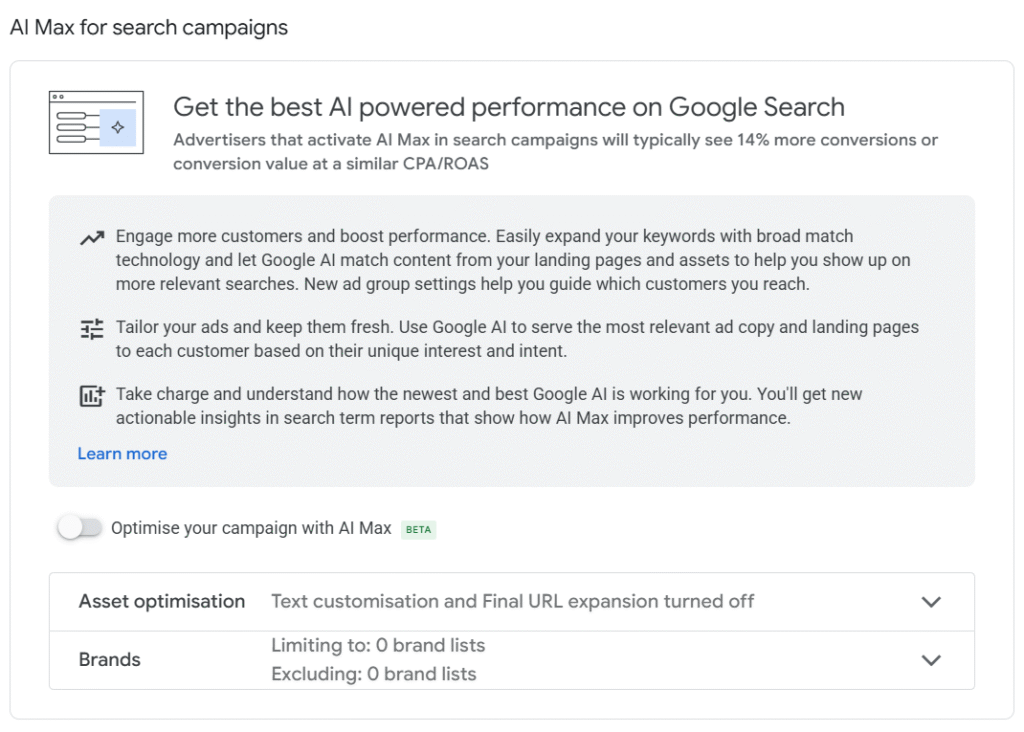 AI Max is not a new campaign type. It is an optional suite of AI-powered features that you can toggle on inside your existing Search campaigns. Think of it as an automation layer: your Search campaigns keep their structure, keywords, ad groups, and settings, but AI Max adds automation capabilities on top.